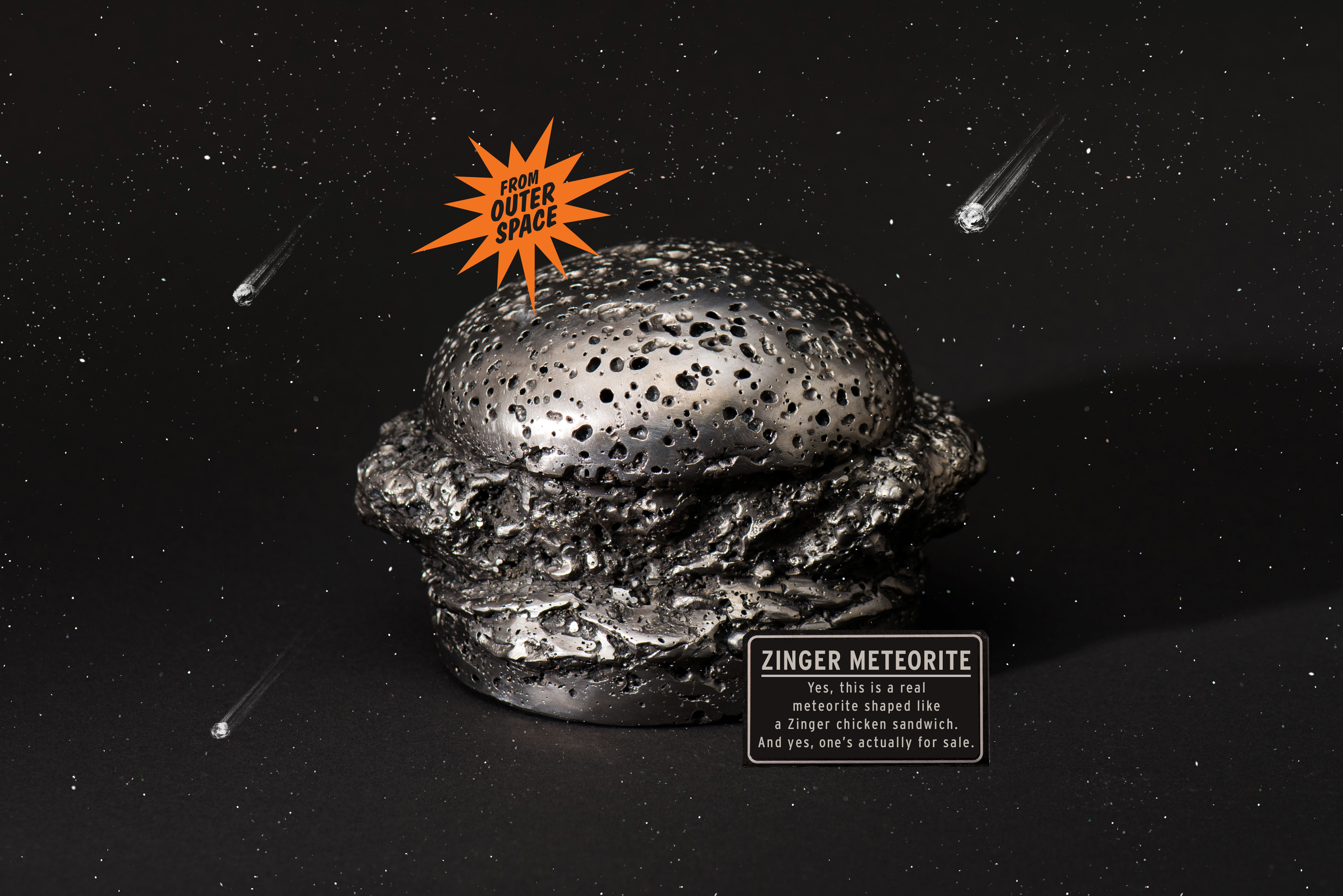 We even created a real meteorite shaped like a chicken sandwich for KFC Ltd., the brand’s e-commerce store which featured a collection of limited-edition fried chicken apparel and merchandise. The meteorite was listed for $20,000, and it took just a little over a week to find a buyer; they happened to be vegan, but lifelong fans of the brand.